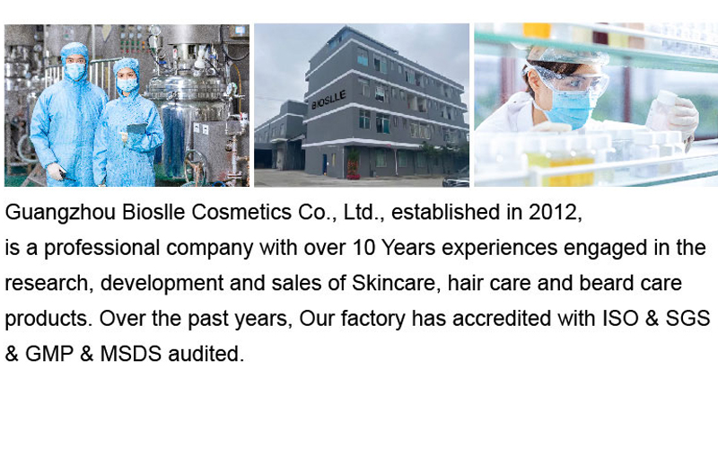 Guangzhou Bioslle Cosmetics Co., Ltd, established in 2012, is a professional company who has many years experiences engaged in the research, development, sales and service of skincare, hair care, beard care and body care products. Over the past years, our wholly owned factory has accredited with ISO 22716 & SGS & GMPC & FDA & MSDS audited. OEM / ODM orders are available with custom logo. Welcome to send us inquiry for more details.