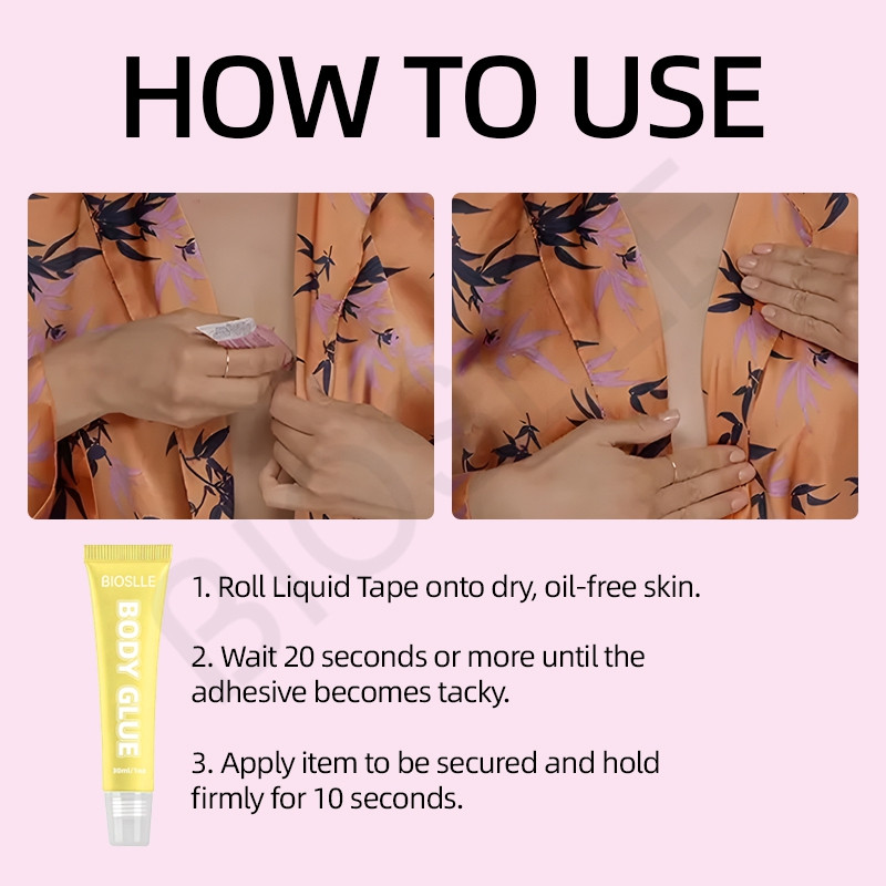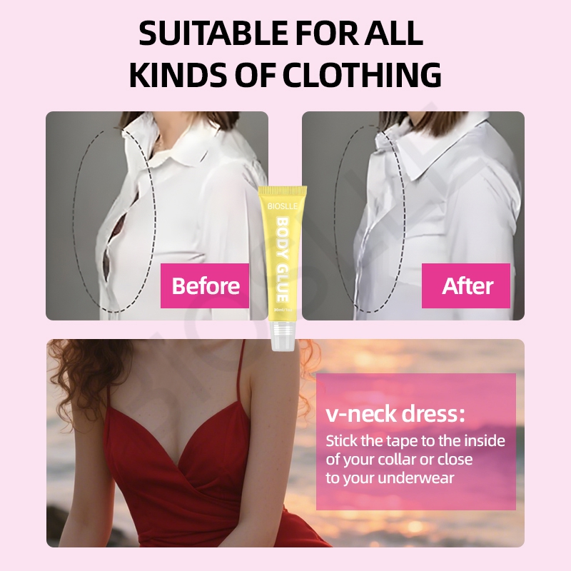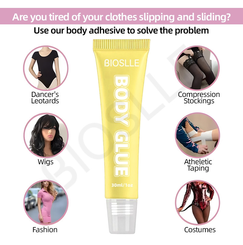 BIOSLLE Body Glue Adhesive is skin-safe, waterproof, and perfect for garments, dresses, costumes, and stage use.