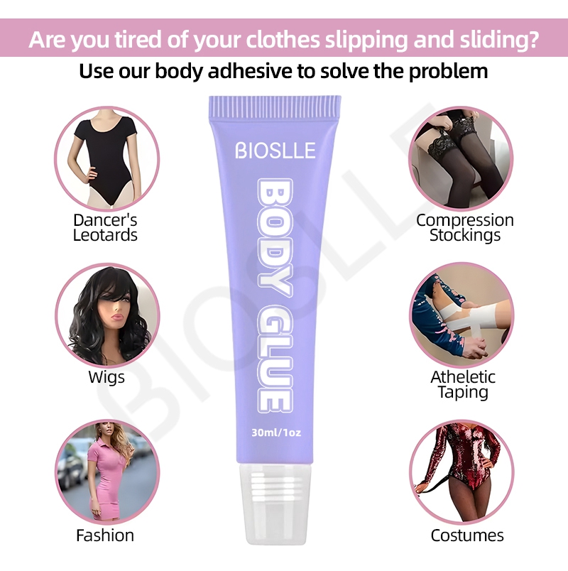 BIOSLLE Body Glue Adhesive is skin-safe, waterproof, and perfect for garments, dresses, costumes, and stage use.