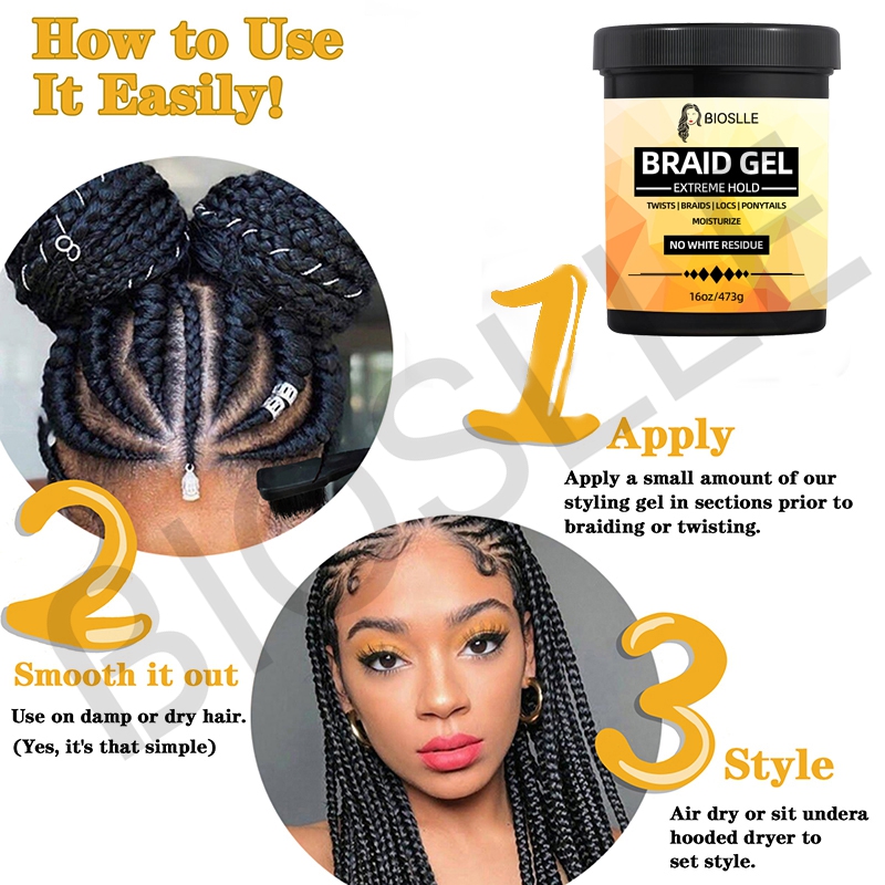 Apply a small amount of gel to hair directly. Braid, twist, and style as desired. Air dry or let it under a hooded dryer to set style.