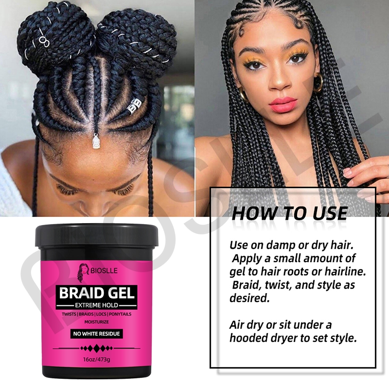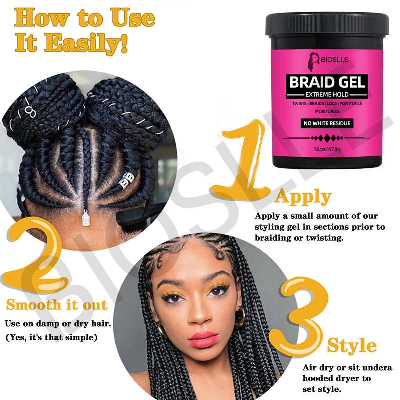 Use on damp or dry hair. Apply a small amount of gel to hair roots or hairline. Braid, twist and style as desired.